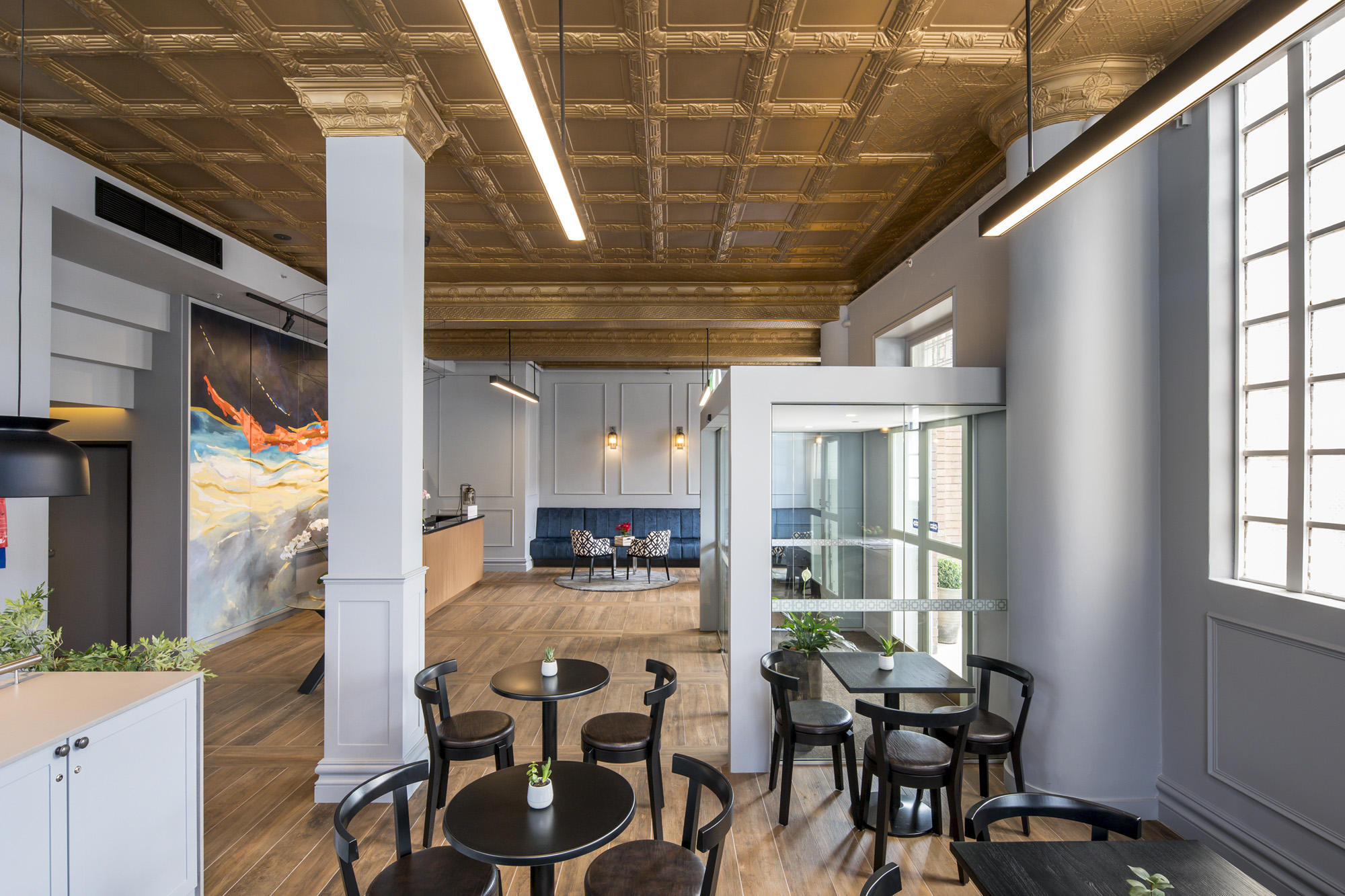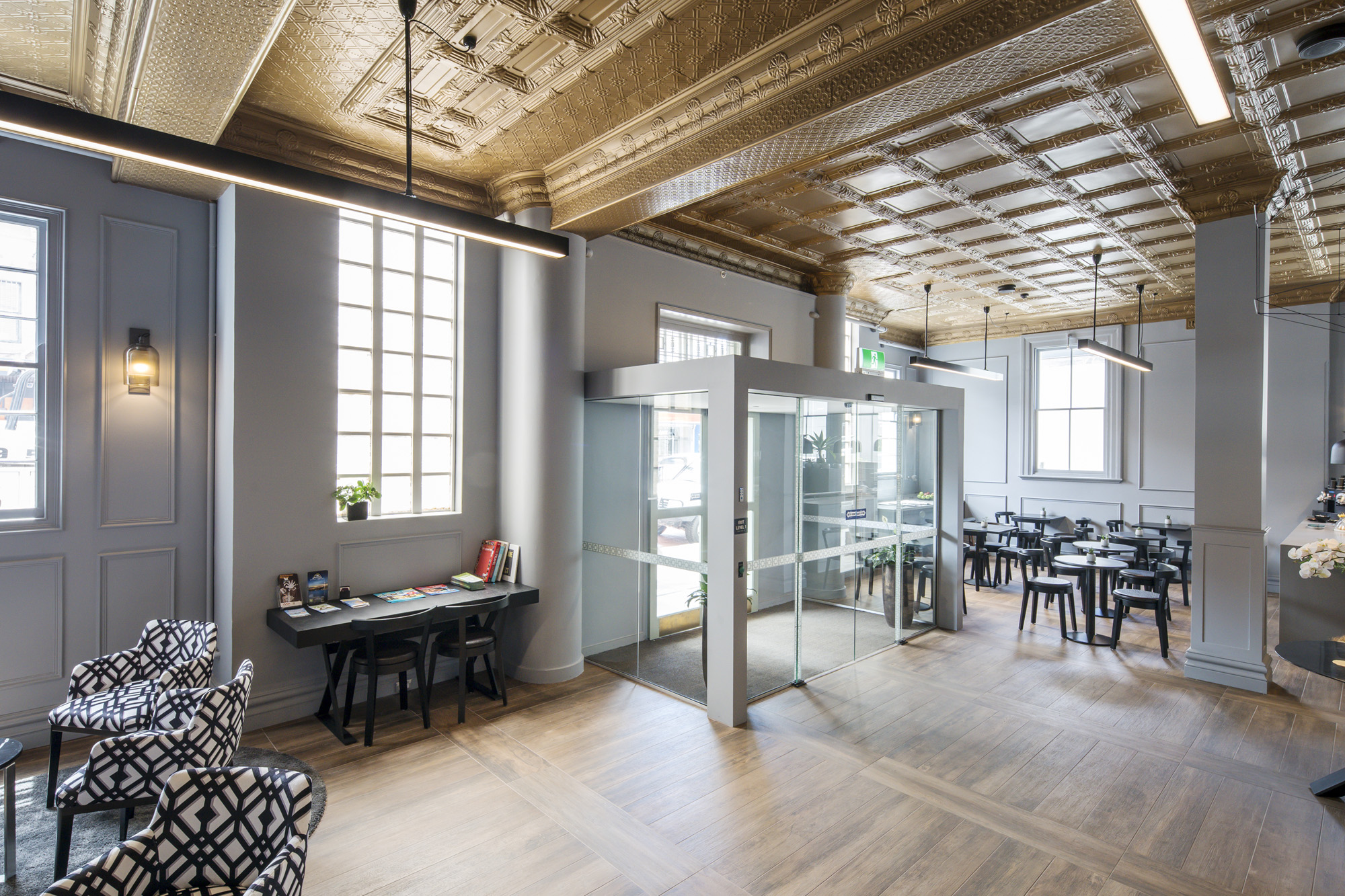 Conservation works have included reconstructing missing elements of the façade, notably the front windows removed in the 1970s, and revealing and repairing the original pressed metal ceiling in the former banking chamber that is likely to date from the original 1914 building. New services have been sensitively incorporated.